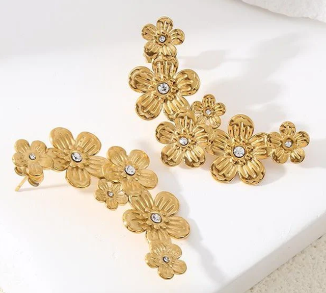 Boucles d'Oreilles Dorées Multi Fleurs Ornées de Strass.
